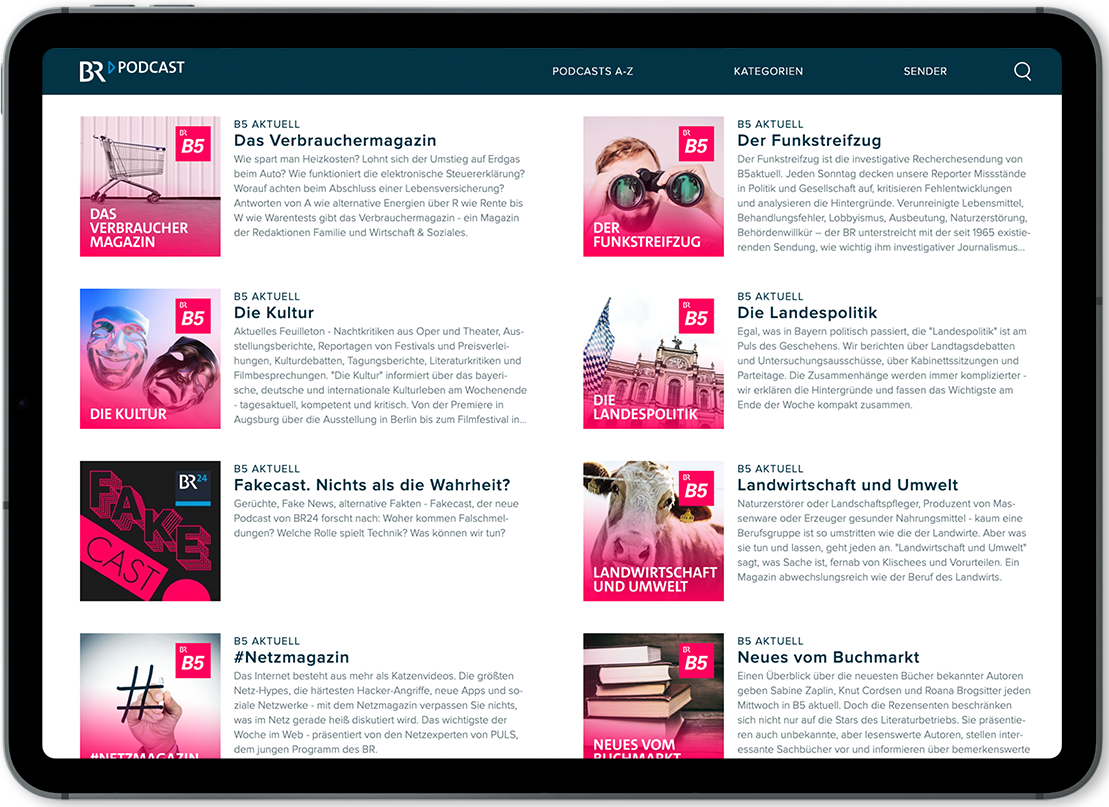 Neben Drittplattformen wie iTunes, Spotify, ARD Audiothek etc. werden die BR Podcasts gesammelt im eigenen Podcast Center angeboten.